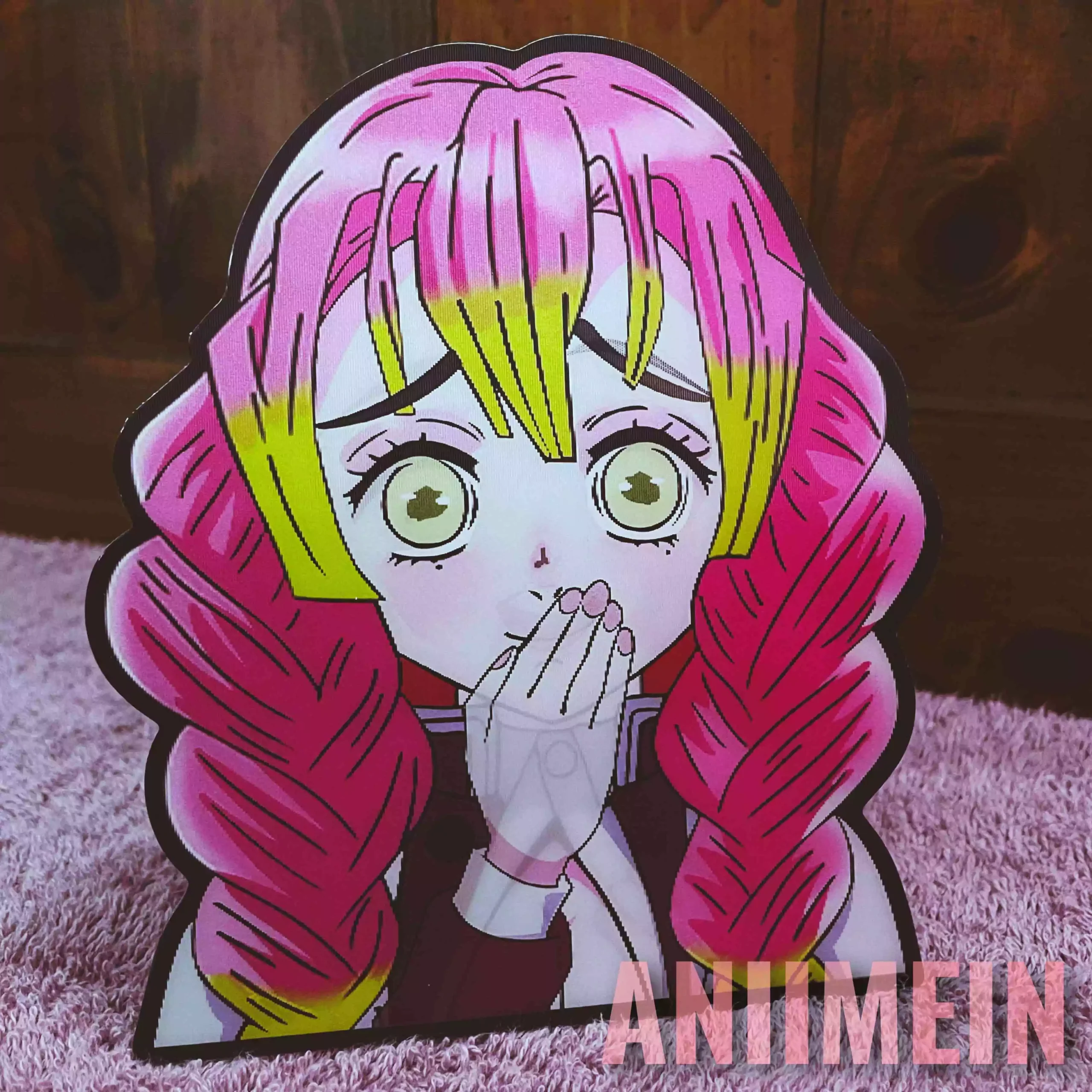 Mitsuri is a voluptuous young woman with a kind face. She has pale green eyes with small moles under each eye. Her most defining feature would be her long hair usually tied in three braids which is pink and fades into neon green halfway through.
